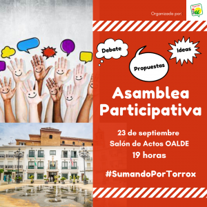 La responsable de política municipal de Izquierda Unida Torrox, María José Prados, hace un llamamiento a toda la ciudadanía, a todos los colectivos para que participen este viernes, día 23 de septiembre, a las 19 horas en el salón de actos del Oalde, frente al teatro, para debatir, escuchar, participar de forma colectiva en un proceso de elaboración conjunta de propuestas para nuestro pueblo.