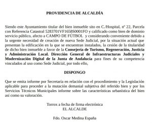 Hay que recordar que en el mes de julio del 2021, el Alcalde, Óscar Medina, convocó un pleno extraordinario para cederle la titularidad de los terrenos del antiguo campo de fútbol a la Junta de Andalucía ante «la urgente necesidad de creación de la nueva Sede Judicial». A fecha de hoy, los terrenos han dejado de ser municipales, y no hay financiación para esa urgente construcción.