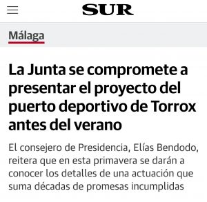 Igualmente, podemos decir con el proyecto del puerto deportivo. Por Torrox se paseó Elías Bendodo, anterior presidente del PP de Málaga, para anunciar a bombo y platillo, que la Junta de Andalucía se comprometía a presentar un proyecto del puerto deportivo antes del verano. Y, según indica Prados, ni rastro de financiación en los presupuestos de la Junta de Andalucía.